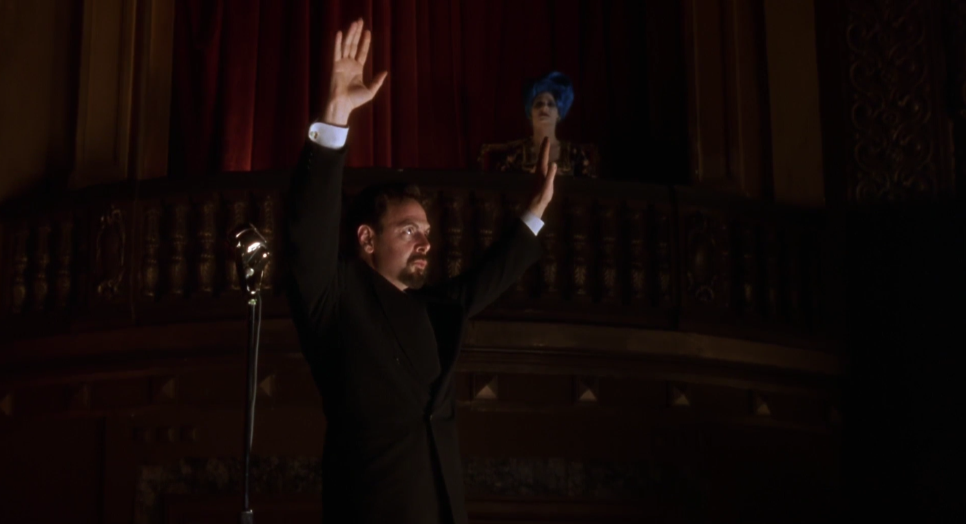 this symbolizes the blue key - (magician hand+blue haired woman) opening the blue box (club silencio), notice that the club is filled with blue lighting and smoke.