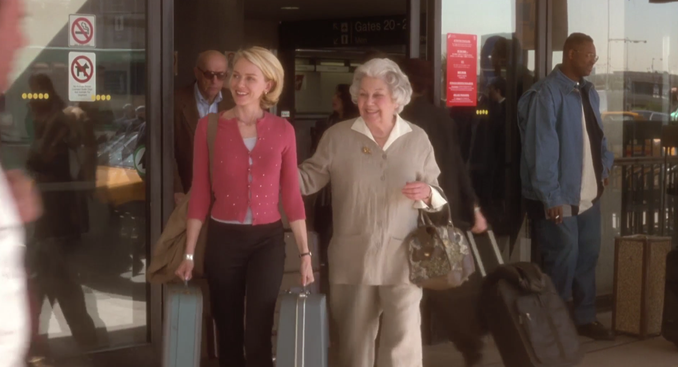 - as the elderly couple leaves the airport, their limo is tailgating a blue van, and as we see their sinister grind there are multiple blue boxes on the rear windshield in the upper right section of the frame.