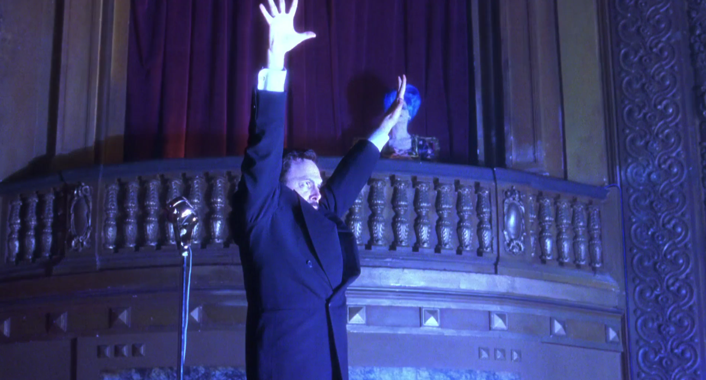 when the magician raises his hands, his fingers hover and cut through the head of the lady on the balcony, and as the thunder strikes, diane is climaxing sexuaully.
