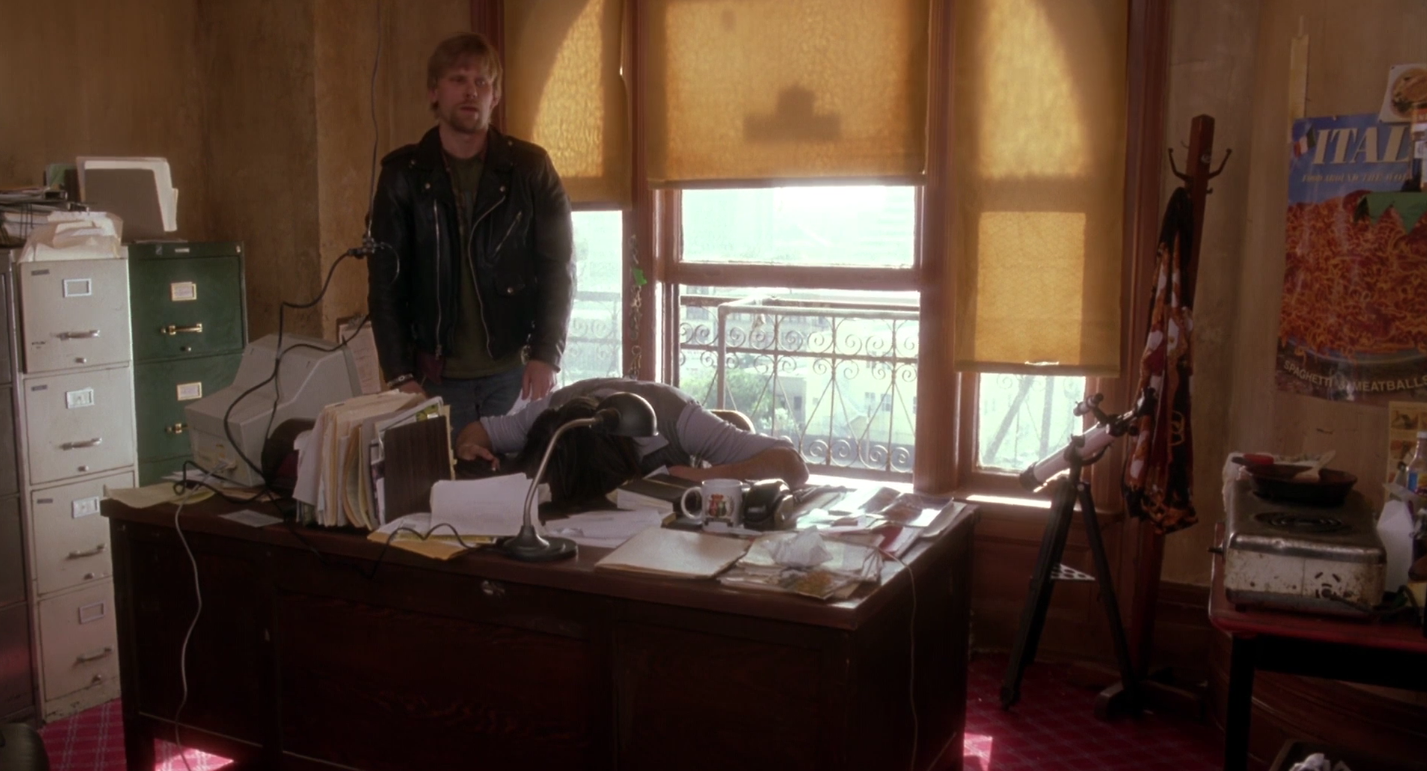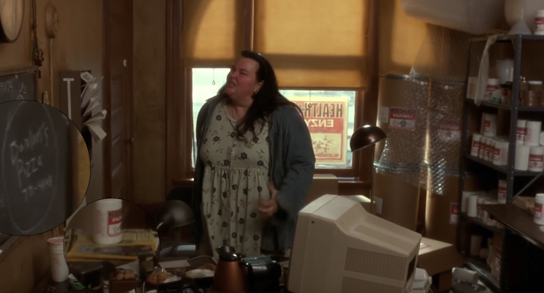 ed's office has a big window with a telescope on a tripod, this represents the unmoving camera looking down the street. the stove and pizza represent the pizza stand. it is as if ed is david rimmer shooting the film. the room next to his office, the one with the hurt lady is full off boxes, food cans, and a lot of junk (including a national geographic issue), the place looks like a props/setting room of a film production. combine that with the pizza and stove, Real Italian Pizza is blantly referenced in this scene.