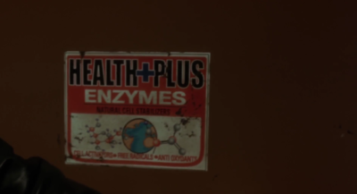 right after Ed says it, Joe shoots Ed in the head, then he shoots at the wall and accidently hurts a lady in a room next door. her door has a picture of the world, phone numbers written on a blackboard, on her desk there's a National Geographic issue (which has a logo of the world also), the whole room is full of boxes with stickers of the world. the company is called Health+Plus Enzymes - natural cell stabilizers