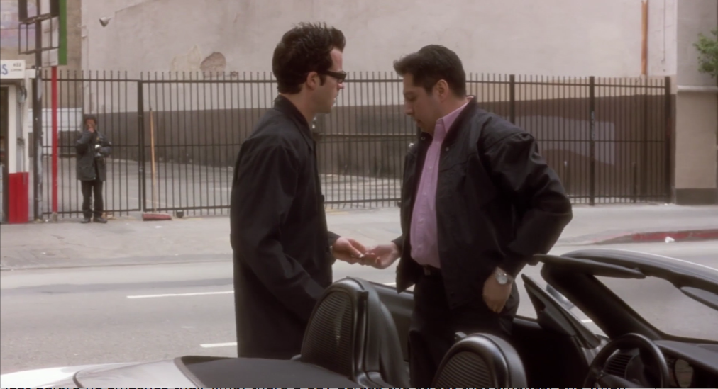 You can have yin-yang opposition in almost any imaginable way. Conscious vs subconscious, life & death, Heaven & Hell, odd & even, etc. The white side of the symbol is Yang, and it represents male. Yin is black, and it represents female. Therefore, a white car smashing into a black one could be a metaphor for sex. Notice that the cars twirl around like the 'dance' we see the assassin do with the fat woman in the office hallway.
